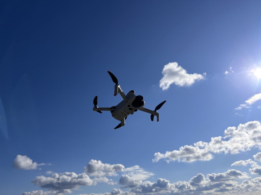 特定飛行ではないのですが、飛行前に飛行計画の通報を行い、携帯した飛行日誌に現場で記入を行いつつ飛行をしました。事故や重大インシデントもなく飛行を行えましたが、とにかく風の影響にずっとヒヤヒヤしていました。体感でかなり強い風で、ドローンを目視していても傾きが大きいように見受けられました。飛行前の風速の計測では最大で4m/sと出ていたので、Mini4Proの仕様上は問題なく飛行できる風速なのですが、風に耐えるように傾いているドローンを見ると、吹っ飛ばされるのではないかとドキドキしました。また、天気が良い日ゆえの悩みとして、ドローンを着陸させた後に撮影した映像を見るために送信機を操作していたのですが、画面の輝度が足りずに見にくかったです。空撮をする上で、これはちょっと対策が必要かもしれません。目視外飛行の限定解除を取得して本格的にモニターを見ながら空撮をすることを考えると、天気が良い日の日光対策を考えておこうと思います。