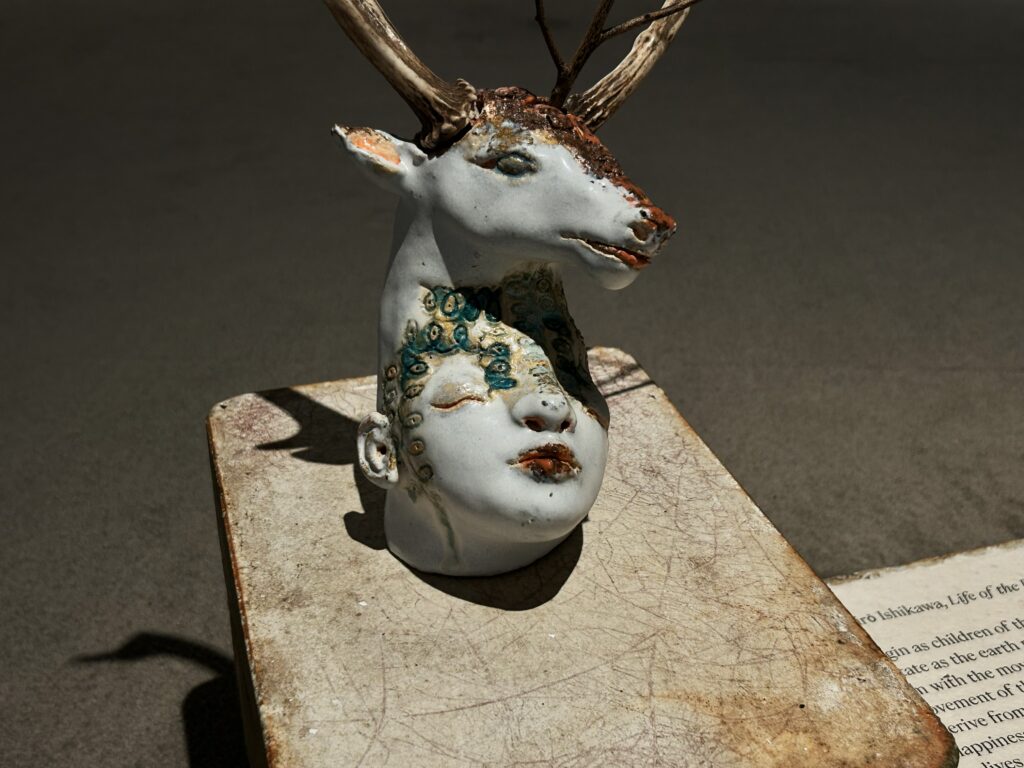 久保寛子さんの作品は、とにかく壮大。青いシートで大きい展示もありつつ、土器のようなものまで。動物がモチーフとなったものもあり、静物でありつつも生き物の強さのようなものを感じる作品でした。