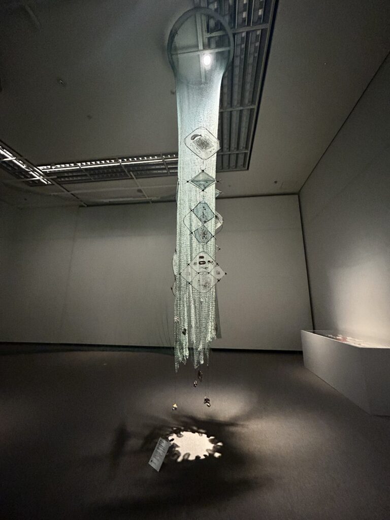 まずは芸術文化センター10階でのムルヤナさんの作品です。<海流と開花のあいだ>というタイトルで、多彩・多色な海の中の景色を編み物で表現されていました。周囲を歩き回ると、照明の加減で昼間の海の中に見えたり、薄暗くなった後の海の中に見えたりと、規模の大きい展示ならではの見方ができ、海にある生物の多様性や生と死を感じることができると思います。個人的には、編み物で作られているのは海の中の生物の積み重ねてきた時間を想像させてくれたので、時間をかけてはぐくまれてた海の豊かさのようなものを感じました。解説を読んだ後、失われていく海の美しさを残そうとする試みの一端なのだなと理解を深めることができました。個人的には人の立像にりみえる珊瑚のかたまりと、クジラの骨が好きでした。