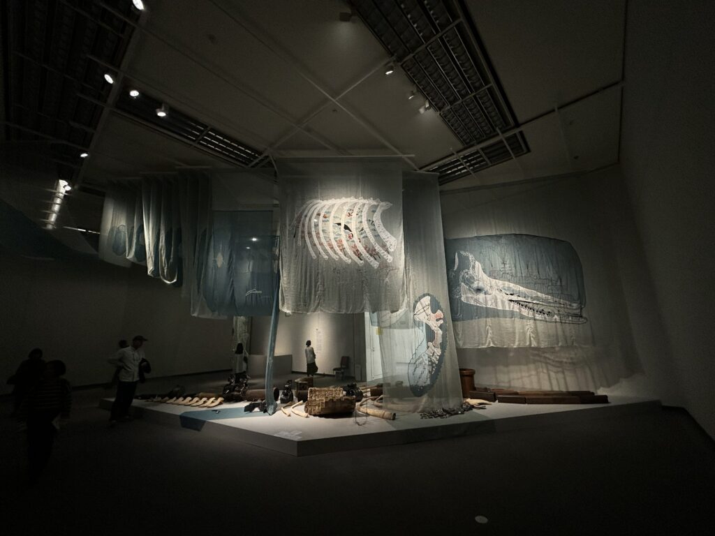 部屋全体が海の中のようで、天井にはゆったりと泳いでいるように見える巨大な鯨、その下には捕鯨のための道具や歴史、資源としての鯨の使われ方、生き物としての話などなど、鯨という雄大な生き物の存在感を感じることができました。海中に降り注ぐ光のようなこの展示もとても良い。